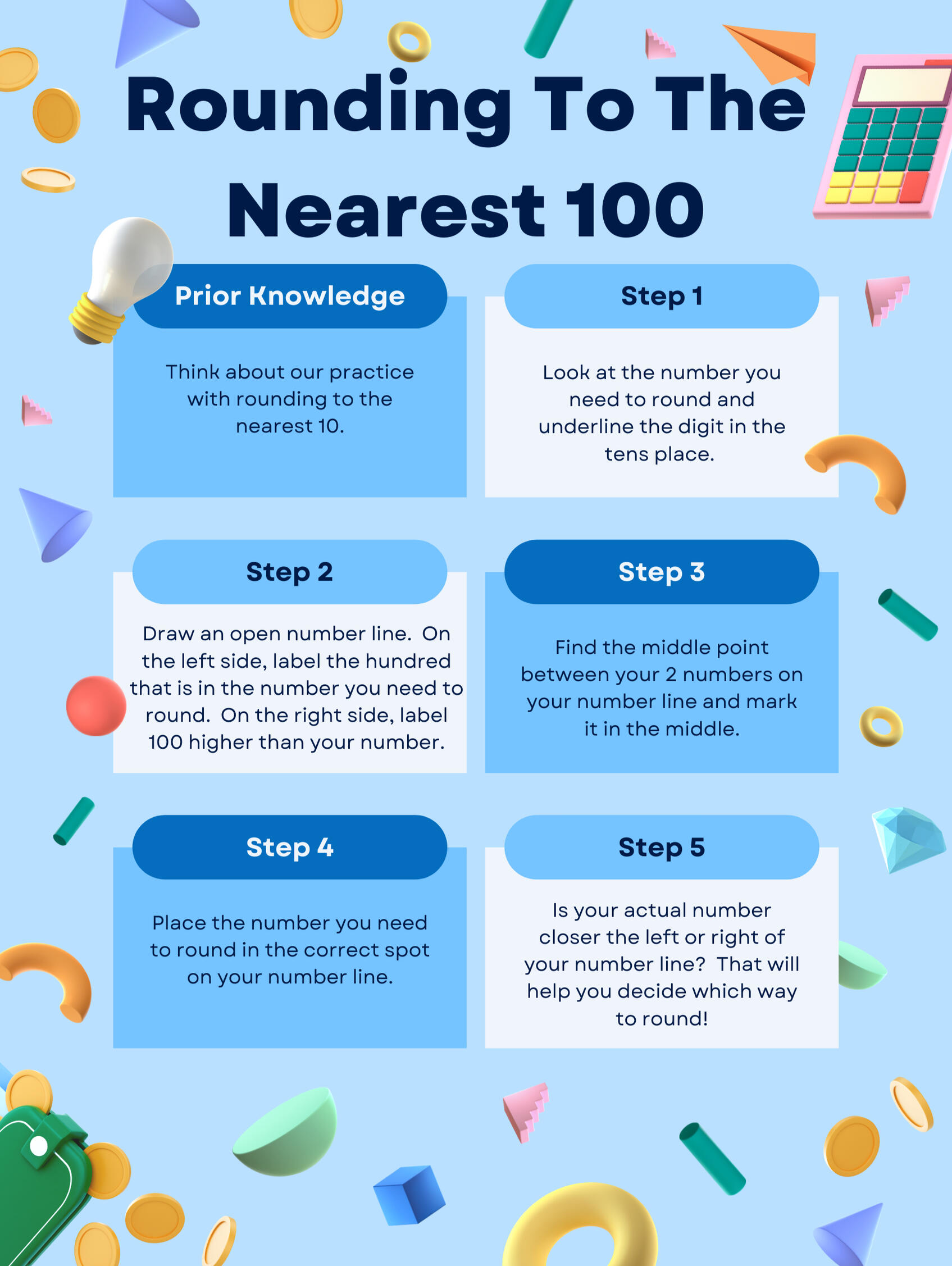 This lesson introduces rounding numbers to the nearest 100 on an open number line. Students will use their background knowledge in previous lessons of rounding to the nearest 10 to complete this lesson.I chose to create this lesson because rounding is a very abstract concept that can be confusing for students and models are a great way to begin practicing.After students completed the assessment, 76% of students (19 students) were able to successfully round numbers to the nearest 100. This data told me that several students were still confusing rounding to the nearest 10 with 100 and needed extra small group, scaffolded practice to show mastery.